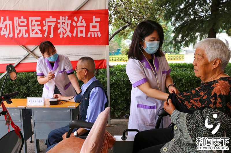 6月7日,在夏县二中考点,夏县妇幼院医生在为考生爷爷奶奶测量血压和听诊检查。