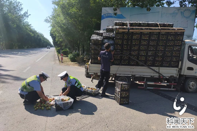 正在附近巡逻的夏县公安局交通管理大队巡警一队民警闻讯后,立即赶往事故现场,在确定无人员受伤后,迅速划定警戒区域,指挥过往车辆减速慢行。因路面水果较多且零散,为尽快恢复交通,帮助驾驶人减少损失,民警主动上前帮助车主装箱,搬运。