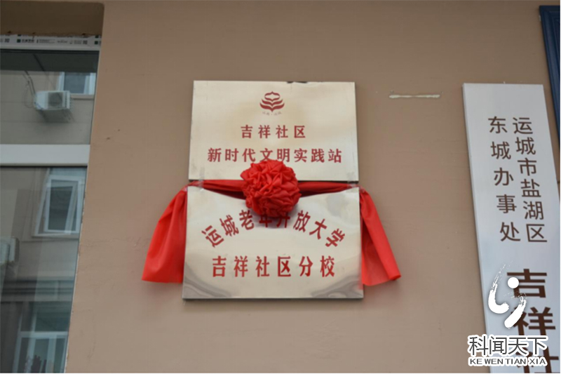 运城开放大学党总支书记孙迎东和吉祥社区党支部书记郝晓荣共同为运城老年开放大学吉祥社区分校揭牌,校长王亚香代表运城开放大学致辞。