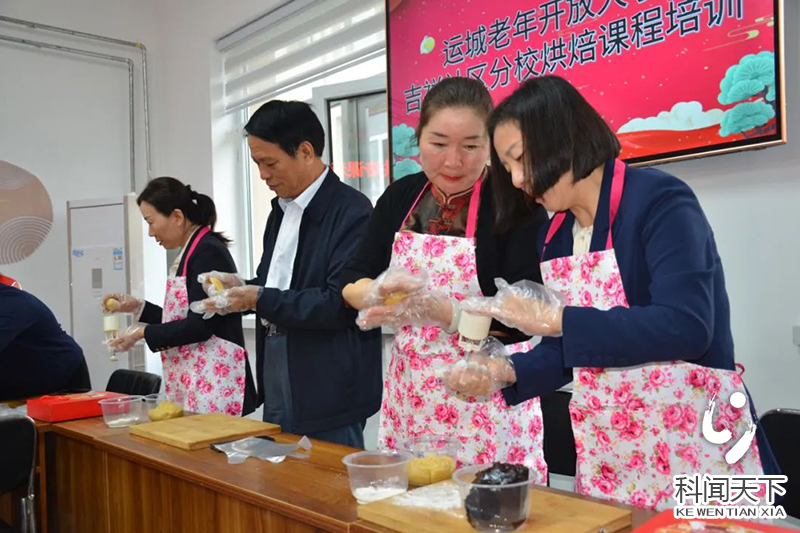挂牌仪式结束后,运城开放大学和吉祥社区联合开展了月饼制作与烘焙课程培训。培训由运城福同惠甜点师傅讲授,30多位中老年朋友在老师指导下兴趣盎然地学习月饼制作技术,基本掌握了相关的技术。