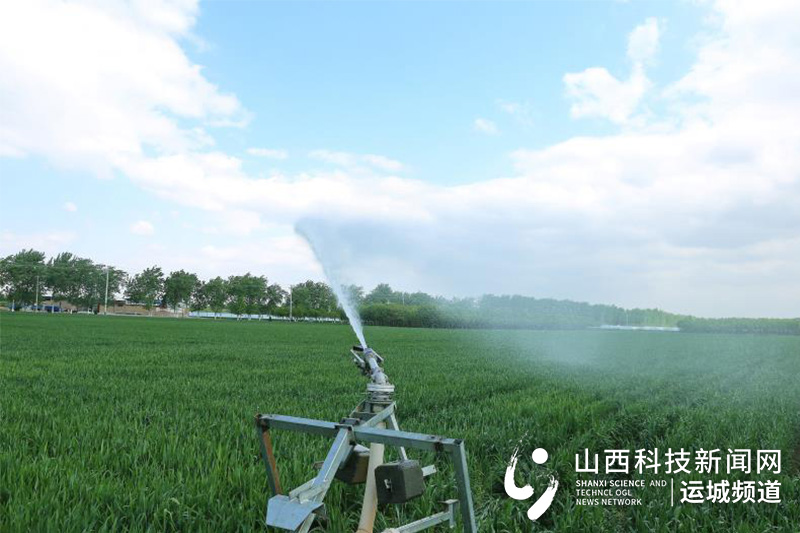 2022年4月18日,夏县胡张乡王学家庭农场,用自走式圈盘喷灌机给小麦浇水,防止吐穗扬花"卡脖旱",确保今年小麦丰产丰收。