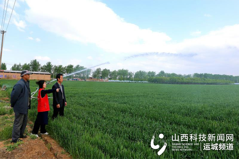 2022年4月18日,夏县胡张乡王学家庭农场负责人和乡干部正在观察麦田灌喷情况。