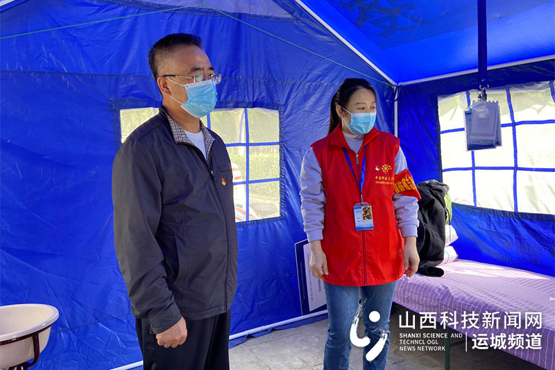 市科协党组书记马国跃走进临时帐篷,仔细查看志愿者们生活环境