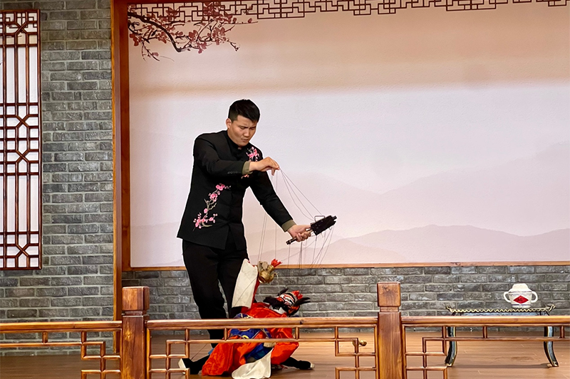 一场经典的非遗文化演出是一部酣畅淋漓的艺术之诗。提线木偶戏源远流长,据考证,“始于汉而兴于唐,盛于明清”。提线作为合阳提线木偶戏的主要表演方法,可让木偶作出各种高难度的特技动作使偶人栩栩如生。加之木偶戏专用的声腔线腔,再配以牛皮筋特制的皮弦胡等专用乐器,合阳提线木偶戏形成了悠扬婉转与激越昂扬的线腔艺术风格,具有浓郁的地方特色与强烈的感染力。
