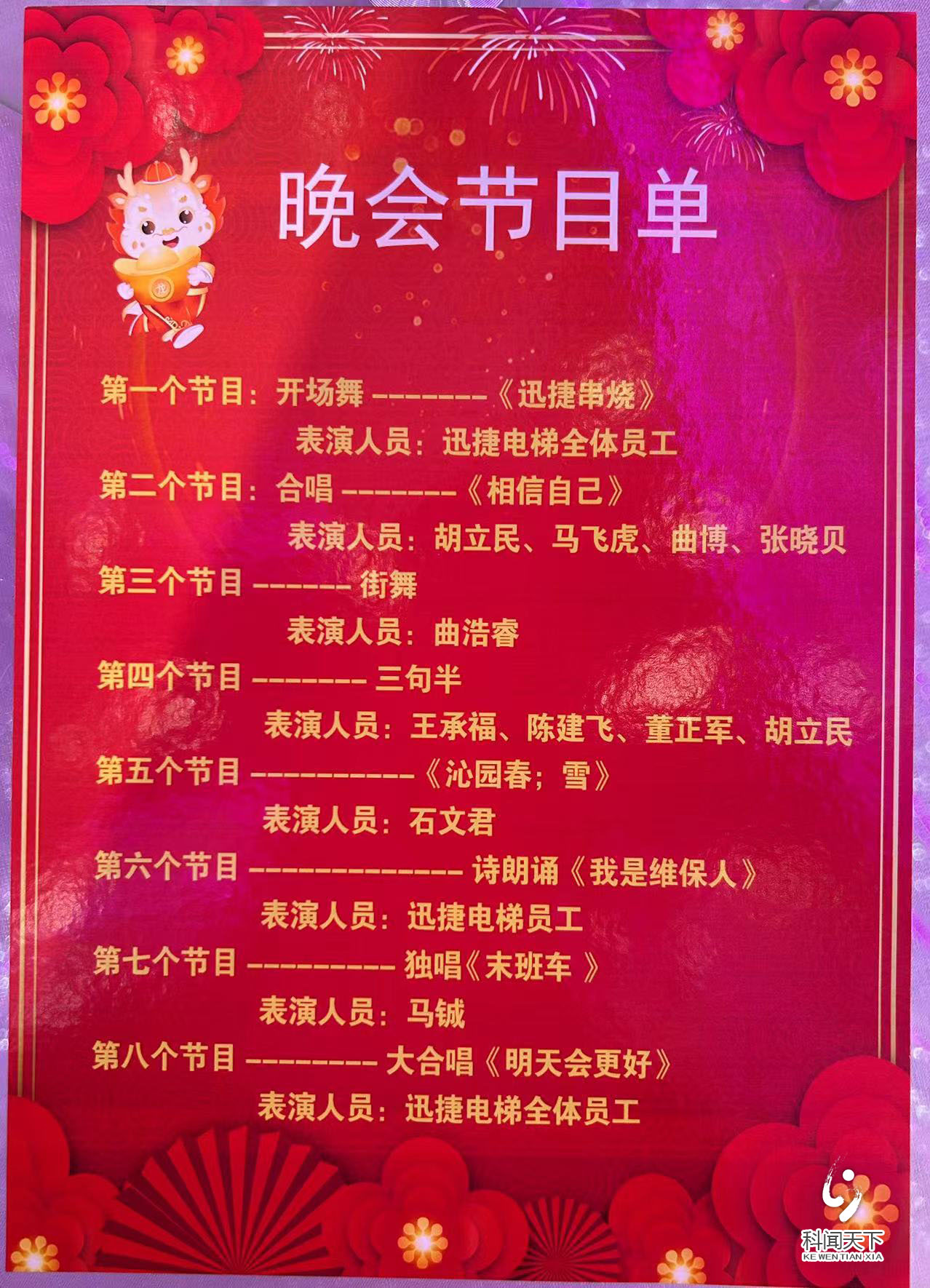 晚会在迅捷电梯全体员工的开场舞《迅捷串烧》中拉开序幕,动感的音乐和优美的舞姿瞬间点燃了现场气氛。接下来,合唱《相信自己》展现了员工们坚定的信念和团结的力量。街舞、三句半、诗朗诵《我是维保人》以及独唱《末班车》等节目也赢得了观众的阵阵掌声。