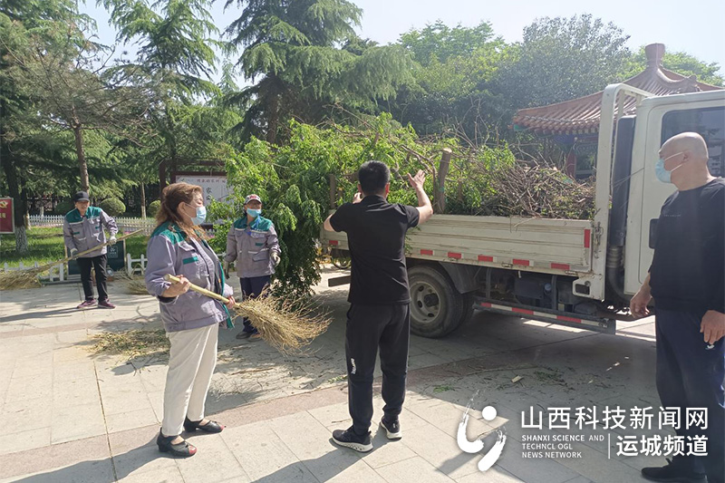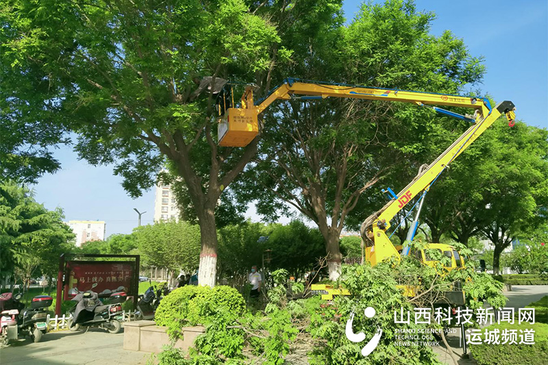 山西科技新闻网运城讯 4月26日,在市园林绿化服务中心圣惠公园,园林工人借助高臂车对公园大树进行精细化修剪,使其达到整形、透光的效果。