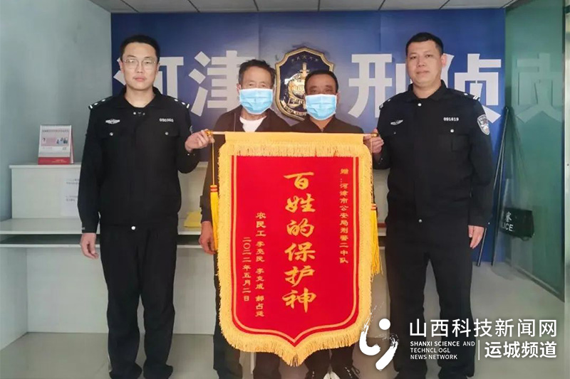 山西科技新闻网运城讯(牛慧霞)2022年5月2日,市民郝某、李某成、李某民三人将一面写有“百姓的保护神”的锦旗送到河津市公安局刑警二中队民警手中,对民警待民如亲的工作态度,认真负责、锲而不舍的办案精神表示高度的赞扬,对挽回全部血汗钱表示深深的感谢。