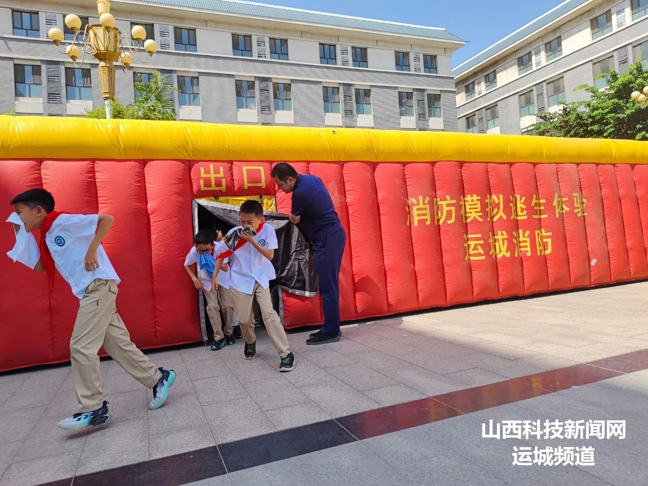 随着警报响起,学校立即启动灾害应急预案,宣传人员有序、迅速地组织师生向空旷的操场疏散演练。演练结束后,师生们在弥漫着浓烟迷雾的模拟逃生帐篷里进行应急疏散逃生。在一句句提醒与互相帮助下,短短几分钟内,参与模拟火灾逃生体验的师生安全地逃出了“火线”。