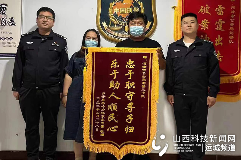 山西科技新闻网运城讯(牛慧霞)4月28日,乡宁县枣岭乡杨某冬夫妇将一面写有“忠于职守寻子归,乐于助人顺民心”的锦旗送到了河津市公安局刑警大队侦查三中队,对帮助他们找回走失女儿的民警表示衷心的感谢。