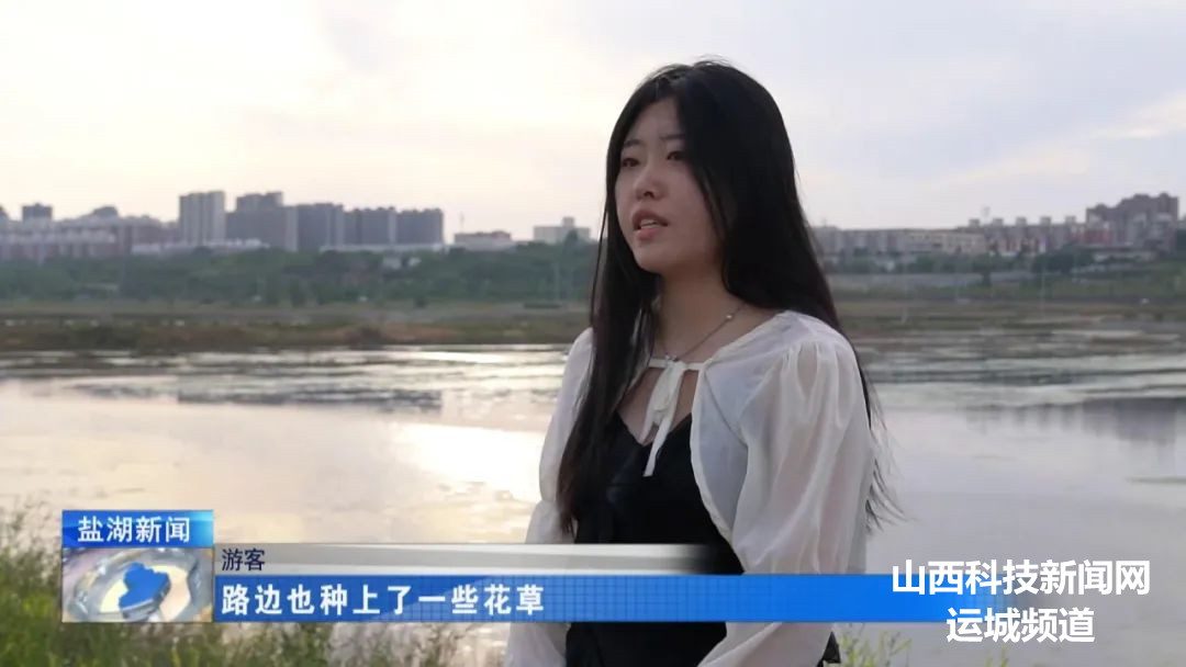 这是我第3次来到盐湖,这次感受和之前不太一样,发现环境变得更好了。路边也种上了一些花草,生态环境变得更加美好,水也更清澈了一点、更蓝了一点。我之前也在网上看到过“五一”时候许多外地游客过来打卡,然后我的朋友也深受吸引,过来找我一起,我带她来这里,也是希望她能看到盐湖的美丽之处。