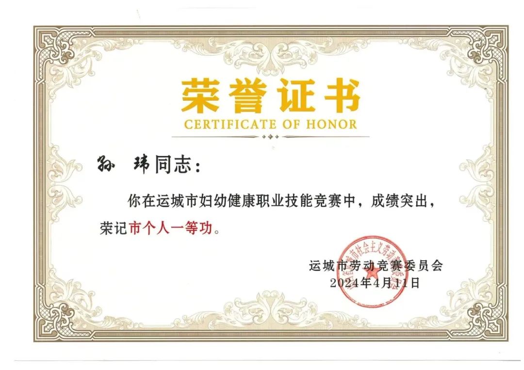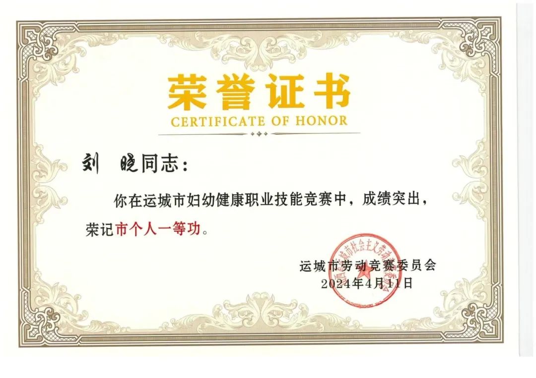 2024年4月11日,运城市妇幼保健院刘晓、孙玮两位同志在全市妇幼健康职业技能竞赛中被运城市劳动竞赛委员会荣记“个人一等功”。
