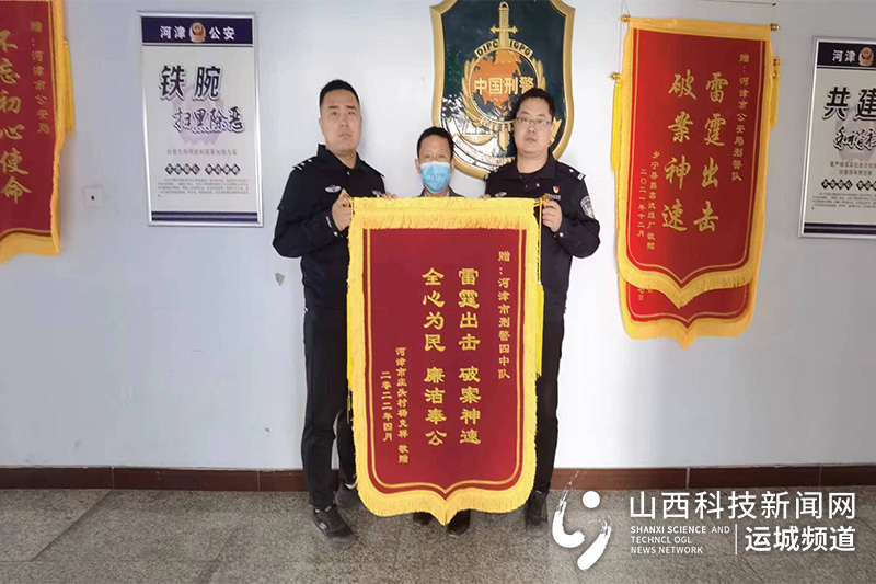 山西科技新闻网运城讯(牛慧霞)5月10日,市民杨先生给河津市公安局刑警四中队民警送来一面写有“雷霆出击 破案神速 全心为民 廉洁奉公”的锦旗,对民警快速帮其挽回经济损失表示感谢。