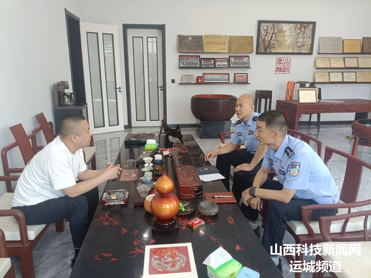 6月11日,新绛县公安局党委副书记、政委尚应东,局党委委员、政工监督室主任王瑞强深入新绛县大唐云雕漆艺厂开展包联企业走访活动,主动上门问需,推动实现领导干部包联企业“应包尽包”,以高质效服务护航企业高质量发展。