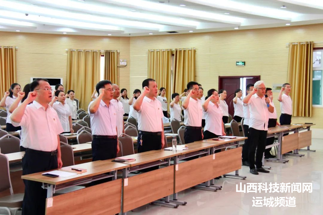 会议在庄严的国歌中拉开帷幕,全体党员重温入党誓词。