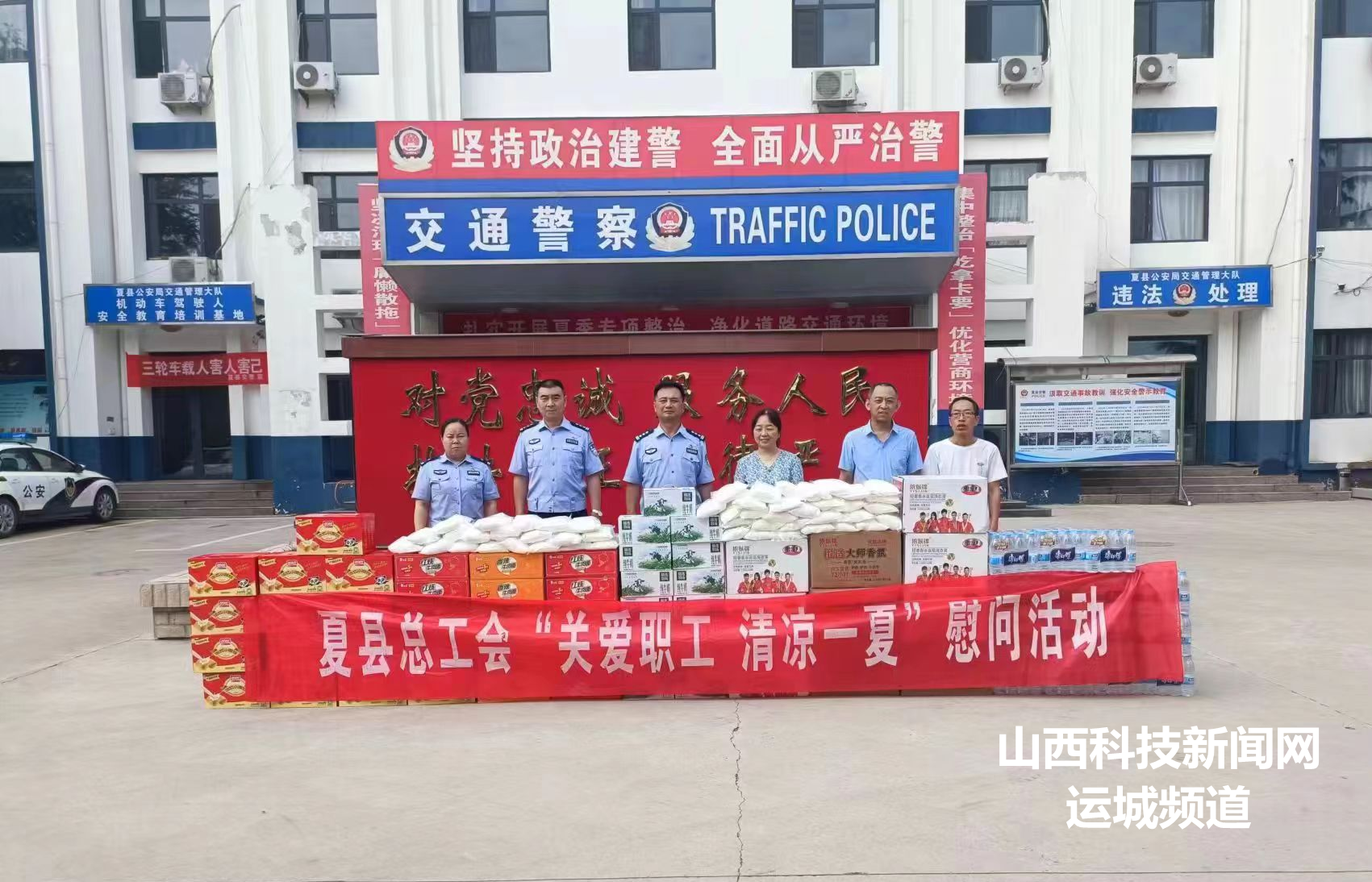 山西科技新闻网运城讯 7月24日上午,县总工会领导到夏县公安局交警大队开展“关爱职工 清凉一夏”慰问活动,为在高温天气下奋战在道路交通管理工作一线的执勤民警辅警送上防暑降温爱心物资。