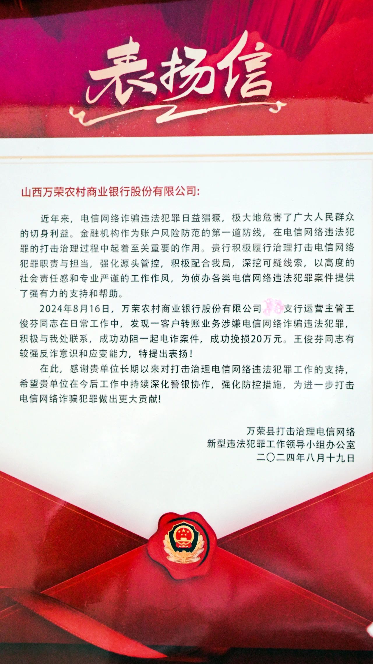 8月16日,万荣农商银行某支行成功拦截一起冒充领导实施诈骗行为,挽回经济损失20万元。
