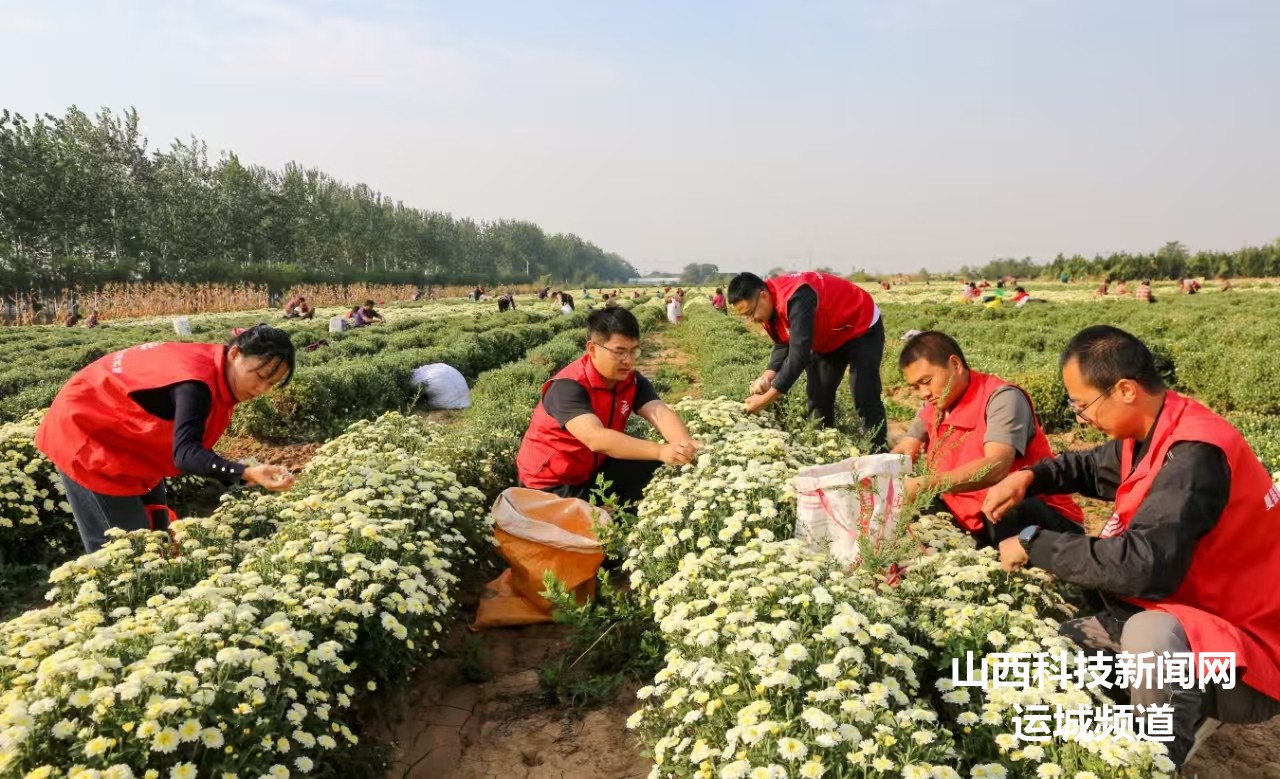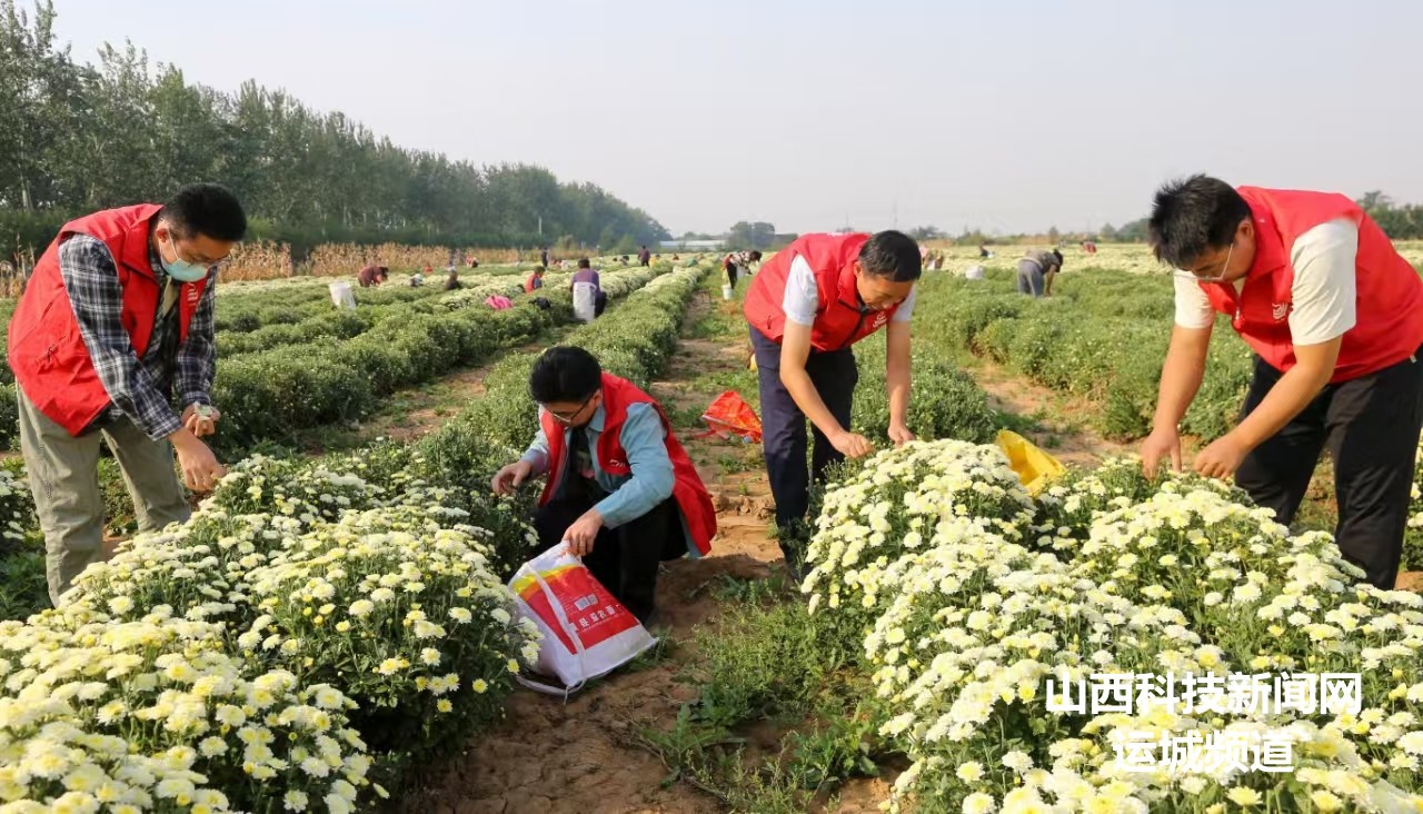 山西科技新闻网运城讯 9月25日,在夏县南大里乡北大里村菊花种植基地,志愿者在帮助农民群众一块采收菊花。