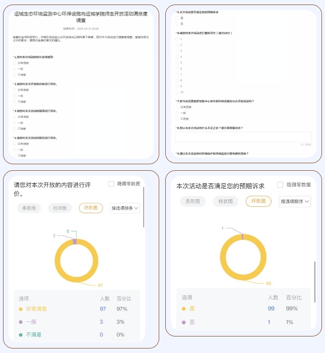 为充分验证本次活动效果,活动结束后,运城监测中心邀请本次活动100名师生匿名填写满意度调查问卷,共涉及9个问题。数据显示,对本次开放的内容非常满意占比97%,达到预期诉求占比99%,其他数据结果均在95%及以上,顺利完成本次开放活动。下一步,运城生态环境监测中心将探索更丰富的开放内容及形式,进一步提升开放水平和实效,持续发力,久久为功,为不断谱写人与自然和谐共生的山西现代化新篇章作出贡献。