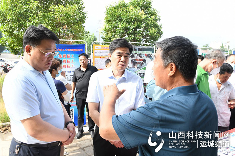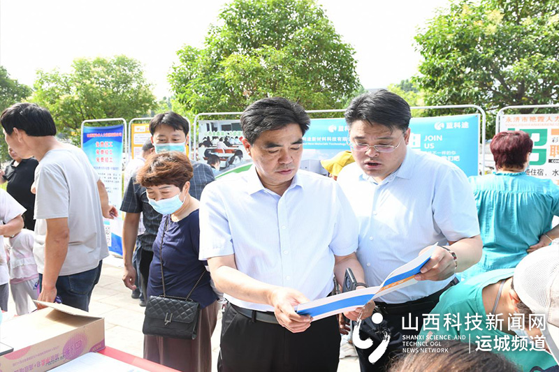 永济市人社局李彬局长和城东街道办事处党工委书记张军峰正在与企业招聘专员询问招聘情况