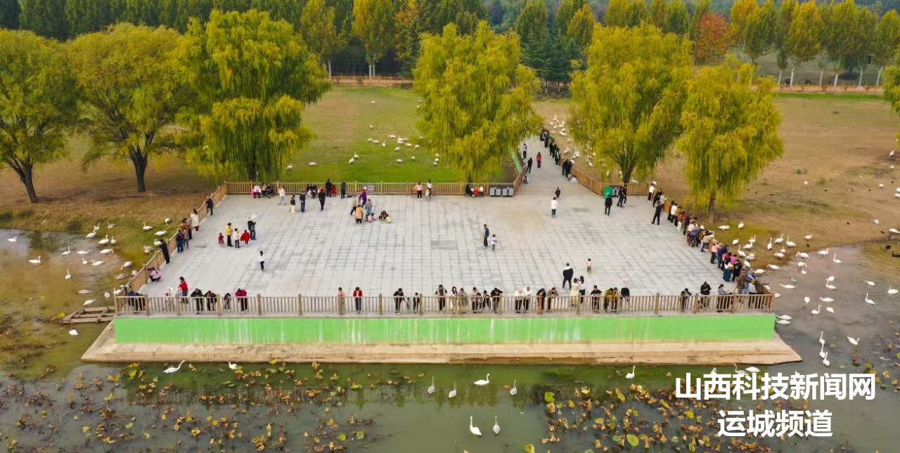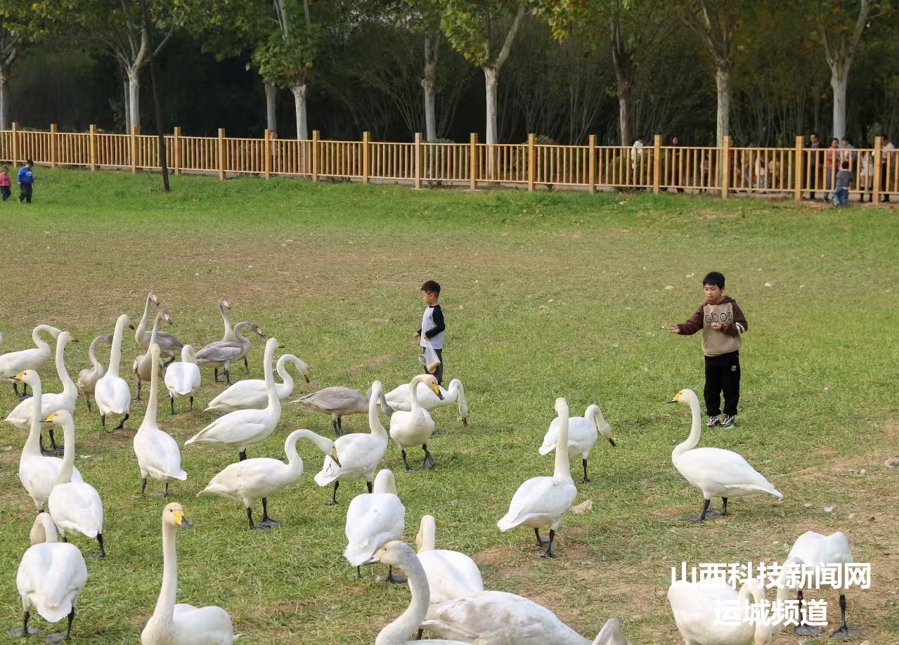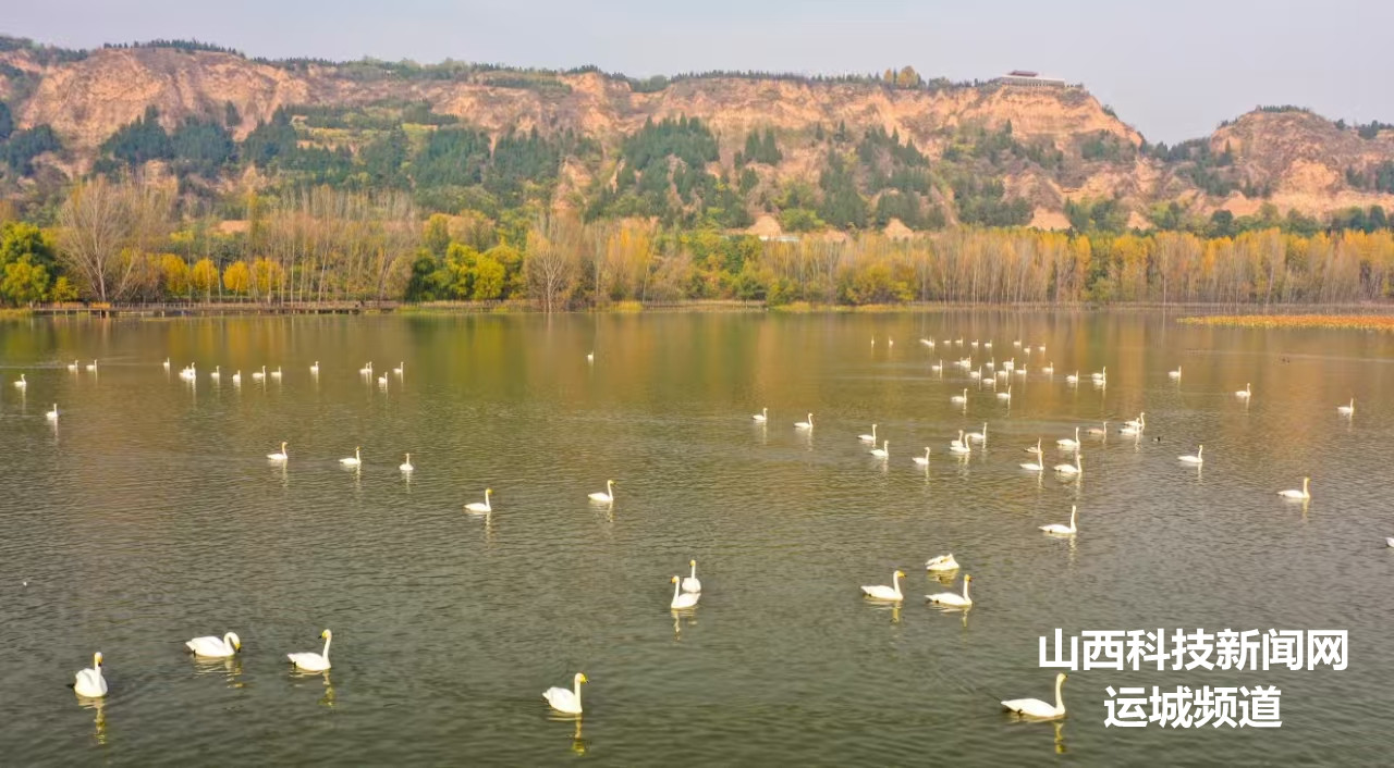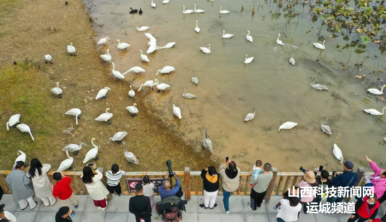 山西科技新闻网运城讯 2024年11月10日,空中俯瞰运城市平陆县三湾黄河湿地,成群野生大天鹅在这里栖息越冬,吸引众多游客赶来游览观赏大天鹅、“零距离”喂食、打卡拍照,展现出一幅人与自然和谐相处的美丽生态画图,成为冬日里一道新的亮丽风景线。